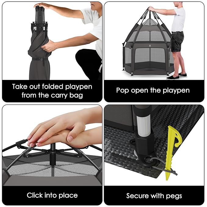 - 【 Our Promise of Wellness 】The travel pack and play is designed with your baby’s health and happiness in mind. Crafted from non-toxic, breathable materials, the playard for baby creates a safe, cozy space for playtime. Whether indoors or outdoors, the small playpen for babies supports wellness and peace of mind. Trust the beach baby tent for everyday comfort and care.