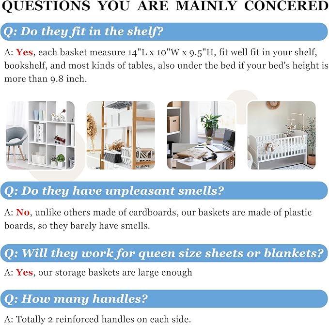 - 【MULTI-PURPOSE】 Our 4 pcs closet storage bins are home essentials to save storage space and keep everything organized. Large enough baskets for organizing clothes, kid’s toys, nursery room items, extra linens, laundry, towels, sheets, pantry and more.
