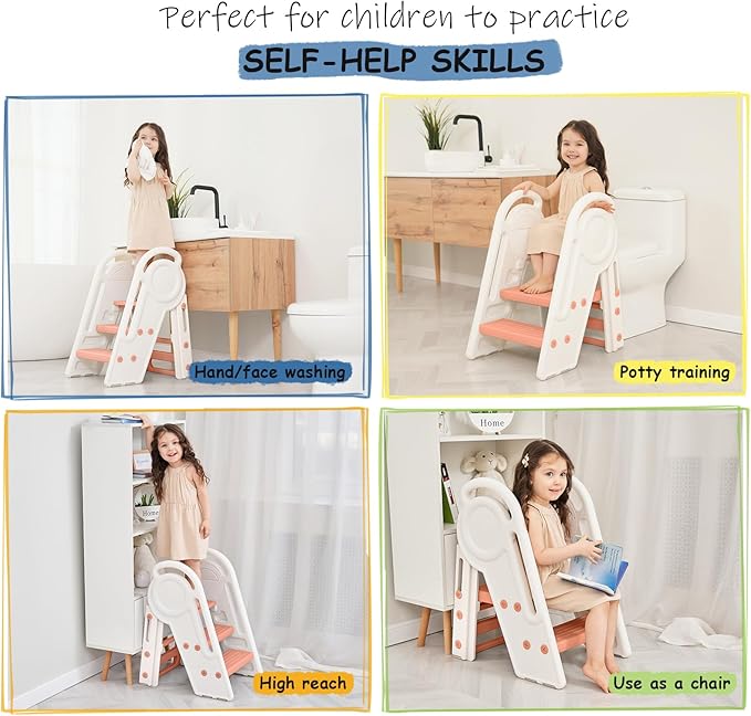 - 【Safety & Versatile】The Harwaya Foldable toddler step stool for bathroom sink is based on stable “A” design construction. The toddler 3 step stool includes 6 non slip grips for extra security and don't slide on tile floors. The plastic 3 step stool for kids helps childrens reach the bathroom sink to wash hands, faces and brush their teeth and also used as toilet potty stool. It also helps kids reach the counters to help Mama cooking or wash dishes in the kitchen.