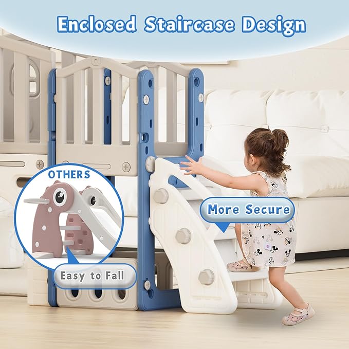 - 9-in-1 Toddler Playground :The toddler slide has 9 activity areas, including stairs, slides, 2 storage spaces, ring-toss game,basketball area, aisle, game board,play telescope and climbing area at the bottom