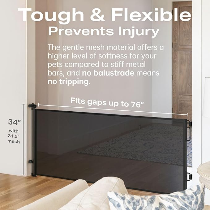 - Expandable Size: Our retractable gate extends up to 76" Extra wide and is 34" tall.The Cumbor mesh dog gate conveniently rolls up when not in use, making it easy to convert the room into an adult-friendly space again