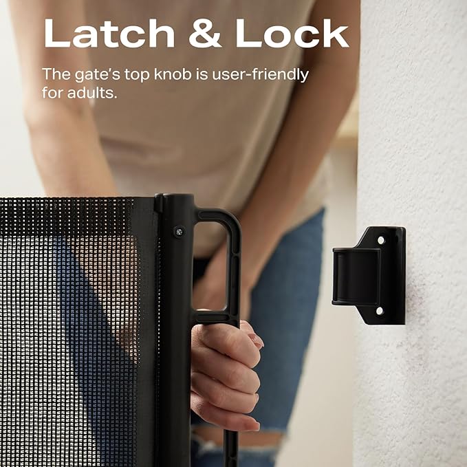 - New Safety Locking: The knob at the top of the mesh gate ensures that the retractable pet gate is easy to use for adults and can be opened and closed with one hand, while curious little ones and pets will not be able to make any naughty bids for freedom