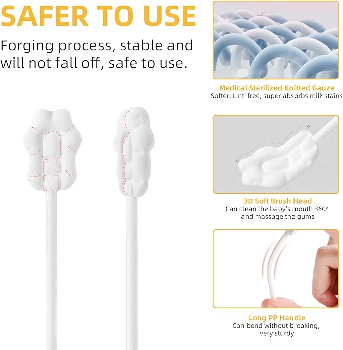 - UPGRADED Cleaning Effect: No Glue, No Lint, No Smell. The soft brush head is made of medical-grade sterilized knitted gauze, which has strong adhesion and upgraded cleaning effect. The PP handle is strong, flexible, BPA free and long enough to easily reach all parts of your baby's mouth.