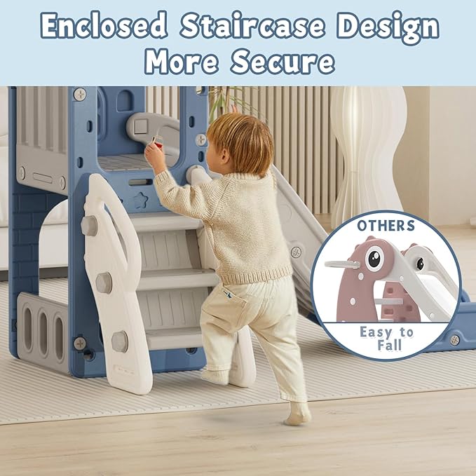 - Safe Design: This toddler slide features raised handrails, non-slip pedals, and scientific step spacing. A widened and extended slide is designed scientifically and ergonomically so that children will slide down smoothly and play safely.