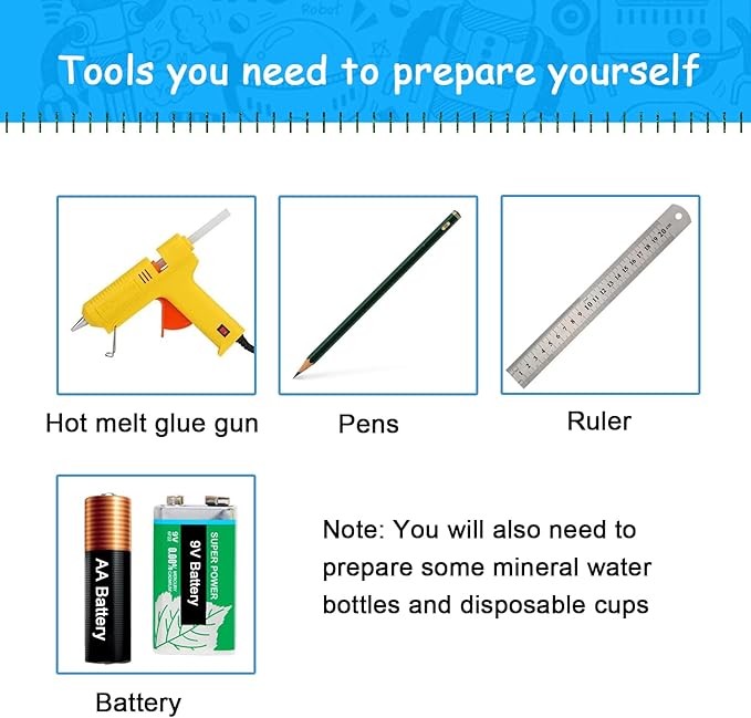 - Pay attention:Suggest to read the instruction manual in detail for assemblyοΌPlease control the usage time, use time should not exceed 5 minutes each time, to avoid short circuits. When your project is completed or unattended, it is recommended that you turn off the switch, remove the battery, and store it properly.Tools for super glue or hot melt adhesive for bonding are not included in the kits. Be careful of scald caused by short circuits. The kids must use it under the supervision of adults