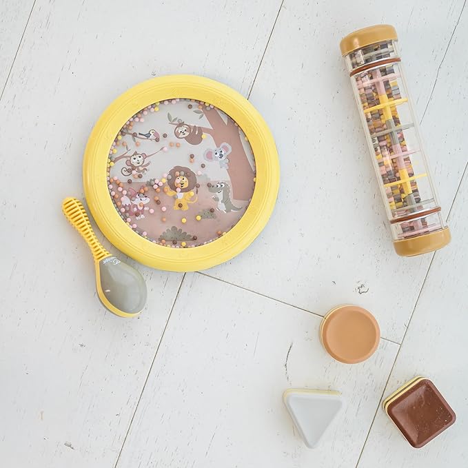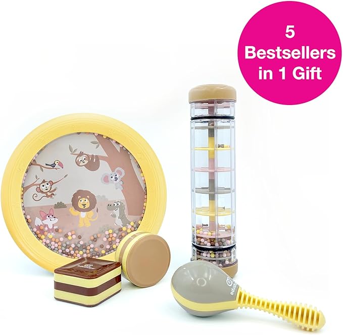- WHAT'S INSIDE: An 8-inch plastic rainstick rainmaker toy, hand drum, shakers, and maracas music instruments for toddlers in minimalist colors. Music set meeting latest safety standards free from BPA and Phthalates. Suitable for ages 18 months and up.