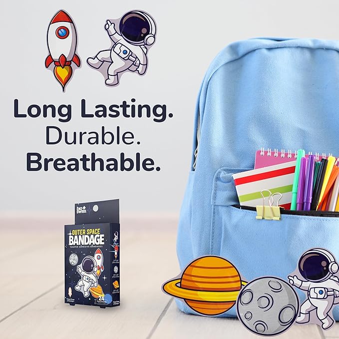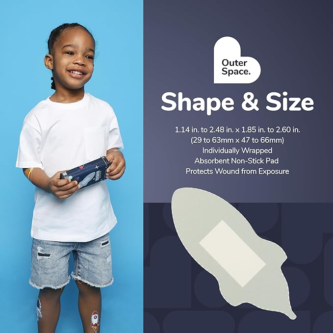 - OUTER SPACE BANDAGES: This 24 piece pack of Outer Space bandages feature fun astronaut, space ship, moon, and planet shapes, and is great for putting a smile on kids' faces while protecting wounds such as cuts, scrapes, and burns; sticky bandages come in a cute cardboard box and are perfect for kids and adults alike, and also for school nurses and pediatric doctors
