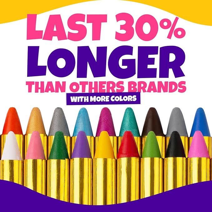- 🎨 𝗩𝗜𝗕𝗥𝗔𝗡𝗧 𝗖𝗢𝗟𝗢𝗥𝗦 𝗪𝗜𝗧𝗛 𝗘𝗔𝗦𝗬 𝗔𝗣𝗣𝗟𝗜𝗖𝗔𝗧𝗜𝗢𝗡 - Our facepaint crayons glide smoothly on the skin, offering a brilliant and bright palette of colors, ideal for creating various designs with ease. At 3.25" long our waterproof face & body paint crayons are 30% longer than any other brand on the market ensuring durable wear for hours of playful imagination. With enough face makeup to be used for 100+ faces they are perfect for parties and events.