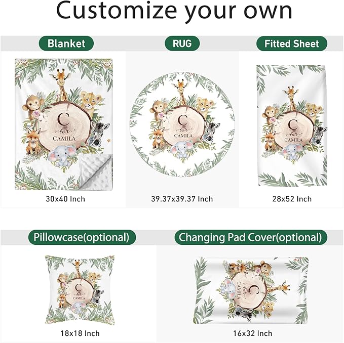 Personalized Baby Crib Bedding Set - Custom Name Animals and Forests 3 Pcs Set - Soft Blanket with Double Layer Dotted Backing, Fitted Sheet, Room Rug for Newborns Boys Girls Shower Gift