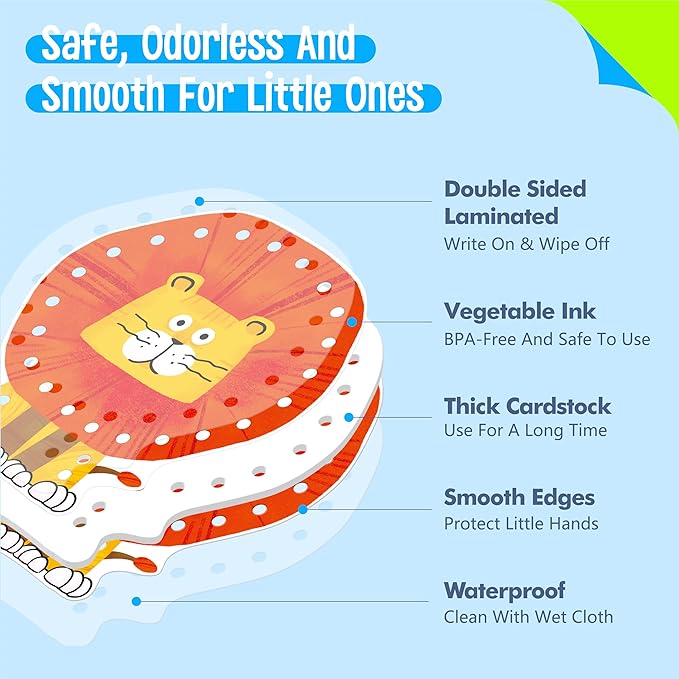 - Premium Material: The lacing cards are made of sturdy cardstock, durable and handy. Printed with premium plant ink, non-toxic and no odd smell, safe enough for toddlersβ use. The laces are made of quality polyester, which is not simple to break, and can serve you for a long time.