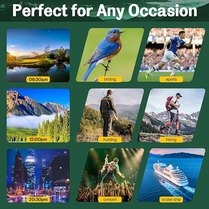 - 【HD Binoculars for Bird Watching & More】 This binocular is perfect for bird watching, watching concerts, sports events, and hiking. Whether you're on a camping, cruise, traveling, or catching an opera, these are your go-to travel companions. Its does not reflect army green shell is your discreet ally in bird watching, blending with nature.