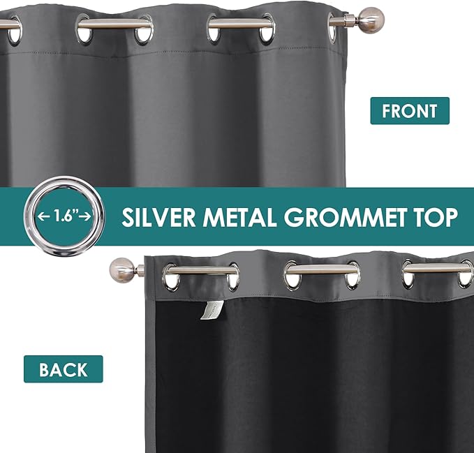 SET DETAILS: Set of 2 gray total blackout curtain panels per package. Each lined curtain measures 52 inch wide by 80 inch long with 8 silver metal grommets (1.6 inch inner diameter) on top, easy to install and slide.