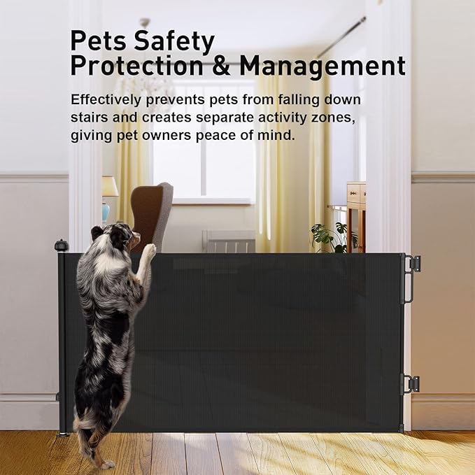 - New Safety Locking: The knob at the top of the mesh gate ensures that the retractable pet gate is easy to use for adults and can be opened and closed with one hand, while curious babies and pets will not be able to make any naughty bids for freedom. For best performance, remember to lock the latch after installation to fully tighten the mesh and ensure stability.