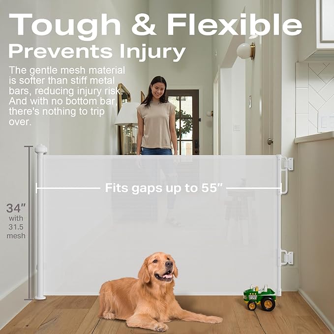 - Expandable Size: Our Retractable Baby Gate extends up to 55" wide and is 34" tall.The Cumbor mesh dog gate conveniently rolls up when not in use, making it easy to convert the room into an adult-friendly space again