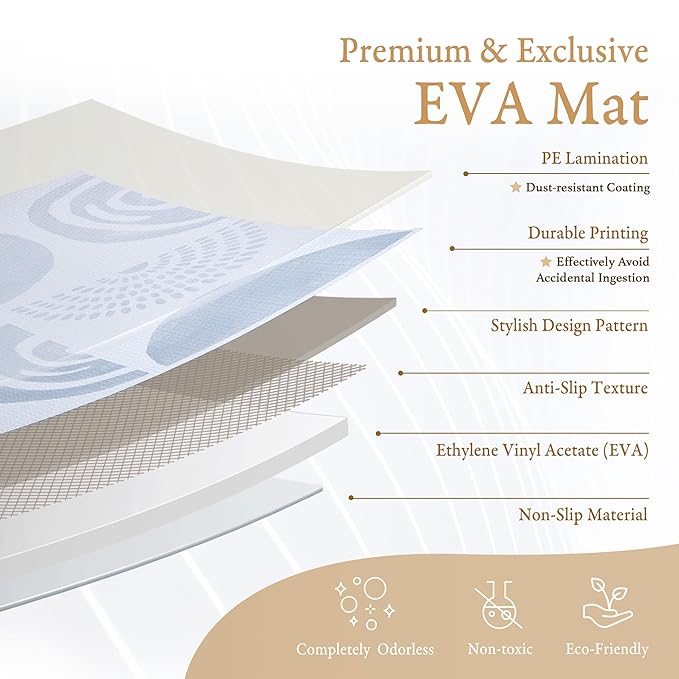 - 【SAFE MATERIALS】Made from durable, shock-absorbing, odorless, and non-toxic EVA foam, our mats ensure safety and comfort. Using a unique printing method, it effectively addresses issues like sun fading and peeling that other brands often encounter, prevents small pieces from breaking off and being accidentally swallowed by babies, and enhances overall durability. With zero-benzene technology, it eliminates toxic odors found in many commercial products, ensuring non-toxic and safe floor mats.