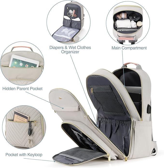 - Convenient and Thoughtful: Baby diaper bag features 15.6’’ padded laptop pocket and 12.9’’ iPad pocket in the main compartment, USB charging port, 2 built-in stroller straps, waterproof pocket, back anti theft pocket, dual zippers for easy access and closure even with one hand! Also we have added a luggage sleeve on the back so it can easily slide over a carryon luggage while on the go.