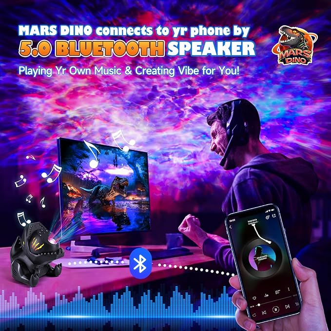 - 5.3 HIFI BLUETOOTH SPEAKER+GREAT SURROUNDING SOUND EFFECTS: Dinosaur galaxy projector for bedroom kids projector is upgraded with 5.3 HIFI Bluetooth speaker.U can connect dinosaur galaxy projector for bedroom kids projector with yr cell phone & play yr own music.U'll be amazed to see galaxy light reacting to music,creating an energetic vibe. Dinosaur galaxy projector for bedroom kids projector, dinosaur night light for kids room is mood lighting for kids! Take dinosaur galaxy projector for bedroom kids projector & dinosaur night light projector to enjoy yr own music & galaxy light for bedroom! U'll love this cute DINOSAUR NIGHT LIGHT FOR KIDS!