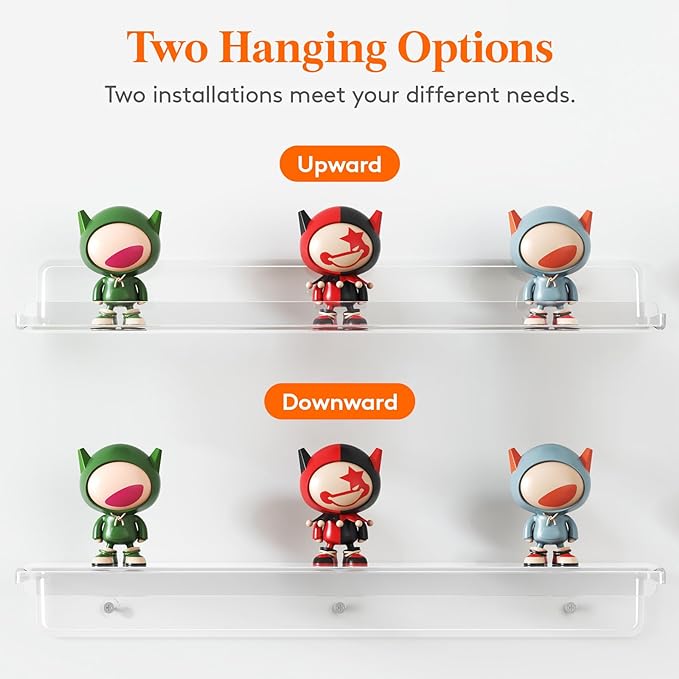 - 2 Ways to Install: The two hanging options are upward or downward. Acrylic shelves come with pre-drilled holes, detailed instructions, and all necessary mounting hardware, including screws, wall anchors, and bubble lever, which make installation simple and easy in just a few minutes.
