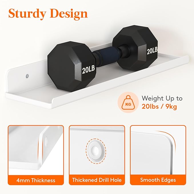 - Sturdy Design: Wall shelves can be securely installed to the wall using expansion screws. It is capable of withstanding a weight of up to 20 pounds(9kg), ensuring durability and preventing easy breakage. It features lip designs on the front and both sides, effectively preventing your belongings from falling off.
