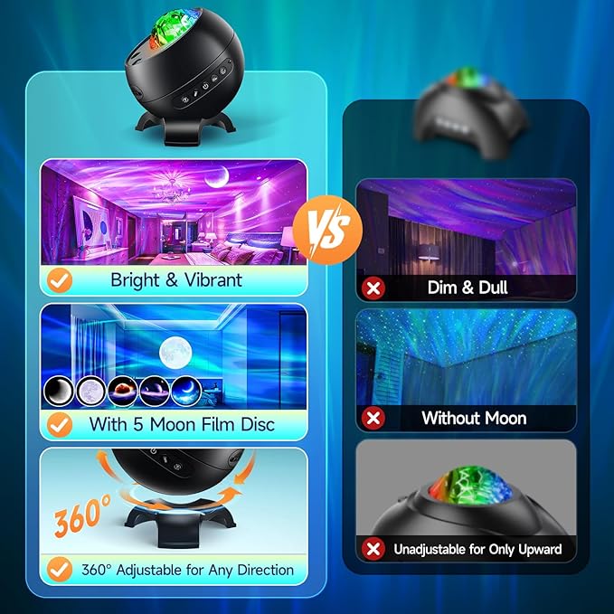 - 【NIGHT LIGHT PROJECTOR WITH 15 SOOTHING SOUNDS】Galaxy projector northern lights has 15 SOOTHING SOUNDS(Storm, Rains, Spring, Birds, Insects, etc.) Galaxy projector helps u unwind with soothing sounds and shifting stars&peaceful moon&gorgeous star projector galaxy light. Whether kids or adults,you can enjoy this galaxy projector northern lights, enjoying every peaceful night.The built-in timer also let you turning off the star projector galaxy light automatically after a set period, saving energy and ensuring a peaceful sleep.TAKE CEILING PROJECTOR, GALAXY LIGHT PROJECTOR & STAR NIGHT LIGHT PROJECTOR MUSIC BOX! Star projector galaxy light galaxy projector grant a peaceful sleep for you!