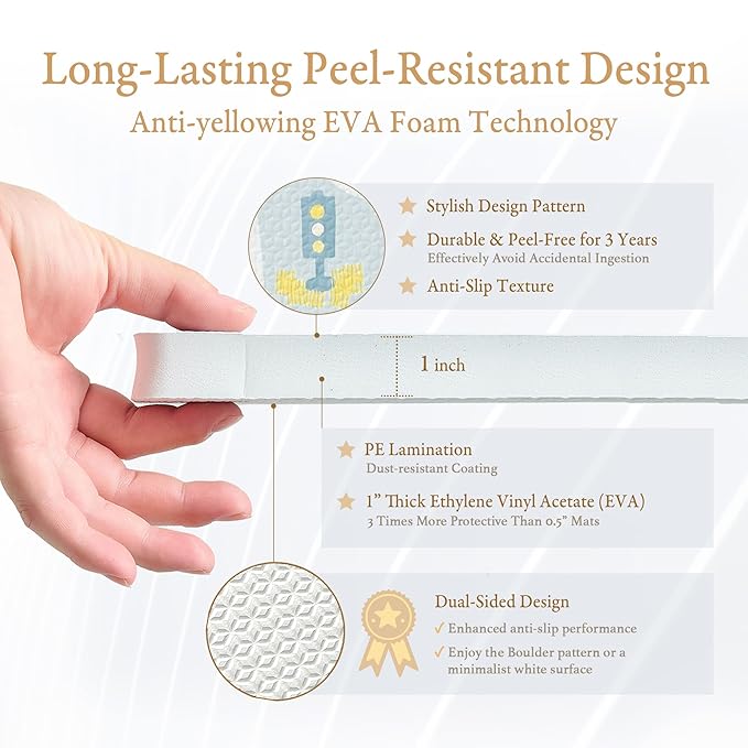 - 【Made from Safe Materials】Made from durable, shock-absorbing, odorless, and non-toxic EVA foam, our mats ensure safety and comfort. Using a unique printing method, it effectively addresses issues like sun fading and peeling that other brands often encounter, prevents small pieces from breaking off and being accidentally swallowed by babies, and enhances overall durability. With zero-benzene technology, it eliminates toxic odors found in many commercial products, ensuring non-toxic and safe floor mats.