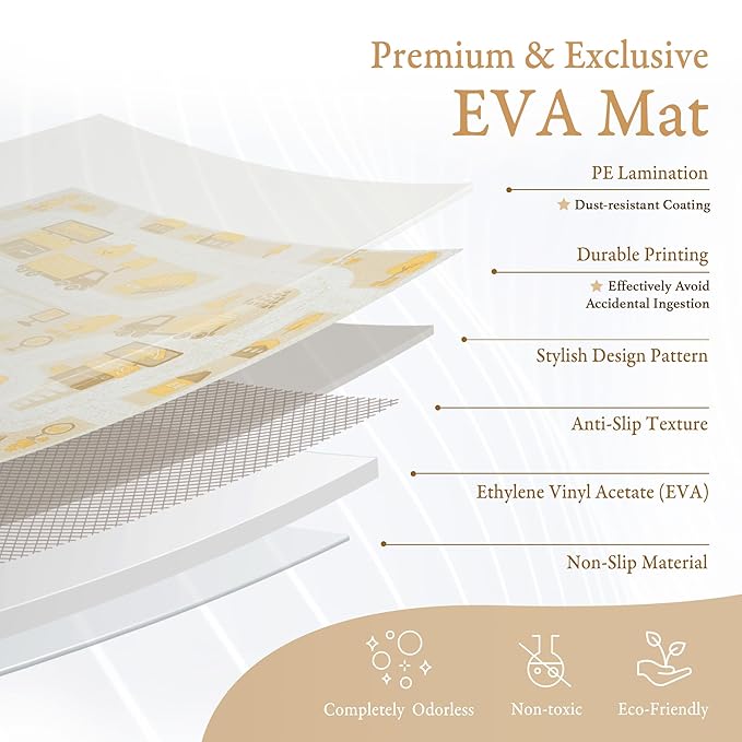 - 【SAFE MATERIALS】Made from durable, shock-absorbing, odorless, and non-toxic EVA foam, our mats ensure safety and comfort. Using a unique printing method, it effectively addresses issues like sun fading and peeling that other brands often encounter, prevents small pieces from breaking off and being accidentally swallowed by babies, and enhances overall durability. With zero-benzene technology, it eliminates toxic odors found in many commercial products, ensuring non-toxic and safe floor mats.