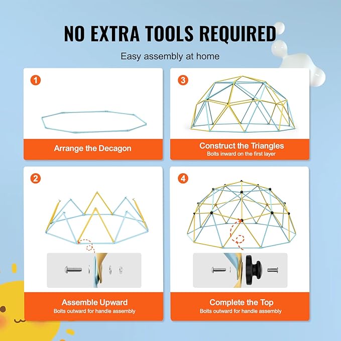 - Easy Setup: Everything you need is included, from installation tools to detailed manuals and video guides. Our clear instructions will effortlessly guide you through assembly, allowing you to quickly create a fun playground for your children with our kids climbing dome.