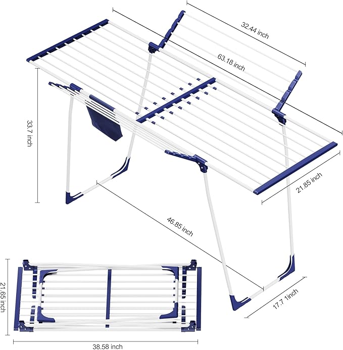 - Expandable Design: Say goodbye to cramped laundry areas! This drying rack features an expandable design which can extend from a compact 38.3 inches to a generous 63.2 inches when unfolded. It provides optimal hanging space for your garments, ensuring efficient drying.