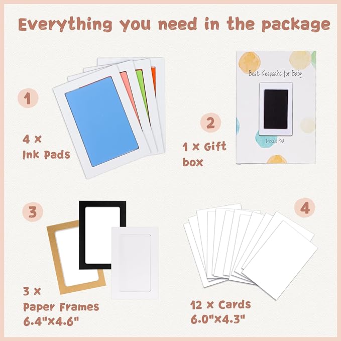 - 【Product Details】: Our baby hand and footprint kit measures 6.0"x4.2" with an ink window of 4.9"x3.1", which is the best size for recording hand and footprints of newborns 0-6 months old or pet paw prints . The ink pad for baby hand and footprints includes 4 clean touch ink pads, 12 stamping cards, and 3 display frames, ensuring you have ample opportunity to capture the best stamp.