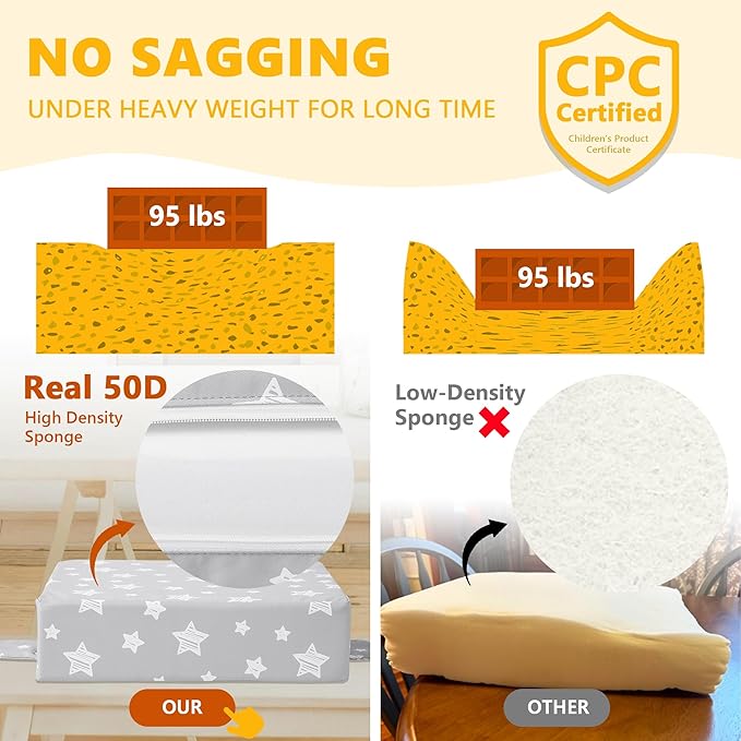 - 【REAL 50D Sponge, ZERO Sagging】The Booster Seat from Sylynvia Brand is of REAL 50D high-density sponge, which ensures softness and comfort while being able to withstand a weight of 80 pounds and will not sag when sitting for a long time, providing excellent support.This means that it has a long service life and your baby can use it from the age of 1 to 8 years old.