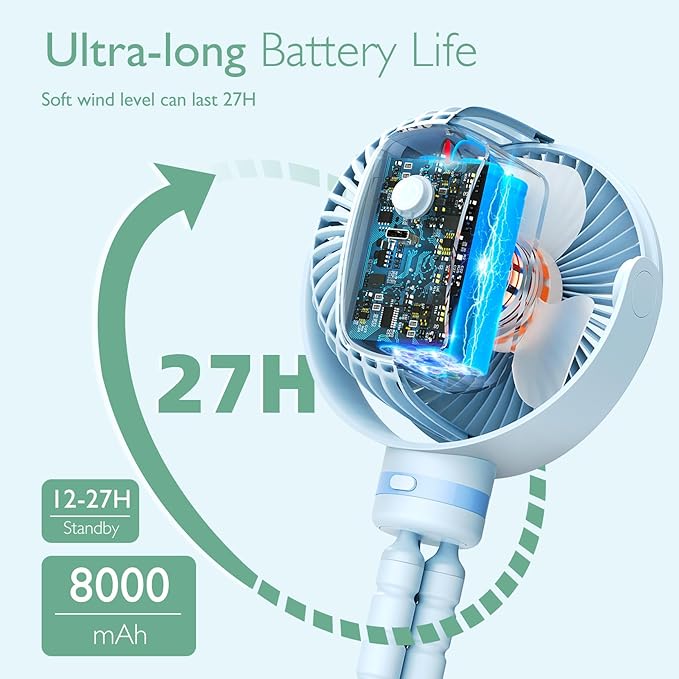 - Ultra-Long Battery Life: The Momcozy portable stroller fan is equipped with a 8000mAh large-capacity battery, which can be used continuously for 12-27 hours depending on the wind speed, and a 1M USB charging cable is provided, which can be conveniently charged anytime and anywhere without distance restrictions. It can be charged via a computer, mobile power bank, car charger, etc. (To ensure the safe operation of the device, please use the original data cable and use a charging device with a standard voltage below 5V)