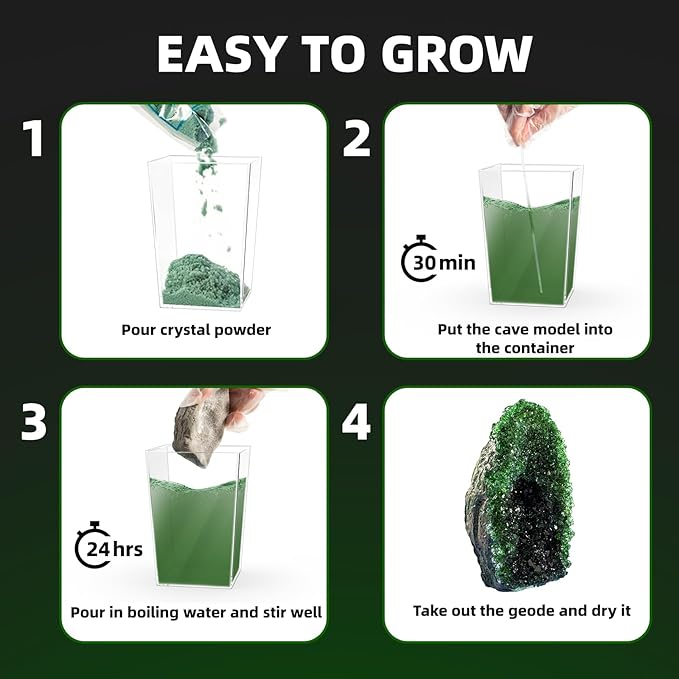- 24-Hour Rapid Growth: The Gobidex Geodes growing kit can grow perfect crystals in just 24 hours, producing crystals larger; Kids can see their experiment results in a short time, it is not only amazing but also stimulates their curiosity