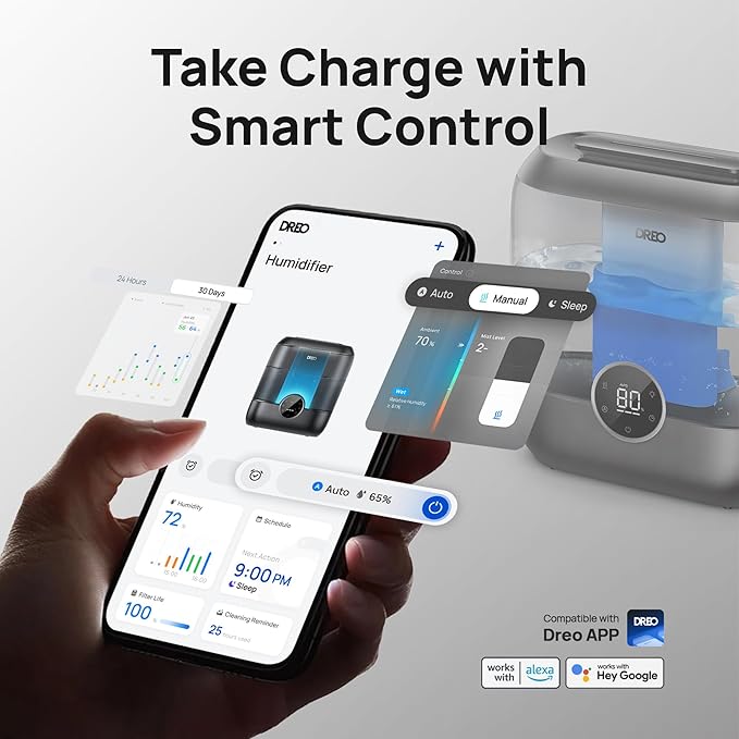 - 𝙃𝙪𝙢𝙞𝙙𝙞𝙛𝙮 𝘾𝙤𝙣𝙩𝙧𝙤𝙡, 𝙒𝙝𝙚𝙧𝙚𝙫𝙚𝙧 𝙔𝙤𝙪 𝘼𝙧𝙚: Use the DREO app, voice commands, or Alexa to remotely manage your cool mist humidifiers for bedroom, Easily monitor indoor humidity and adjust settings to ensure a healthy environment for your family, especially suited for babies, pets and plants indoor.
