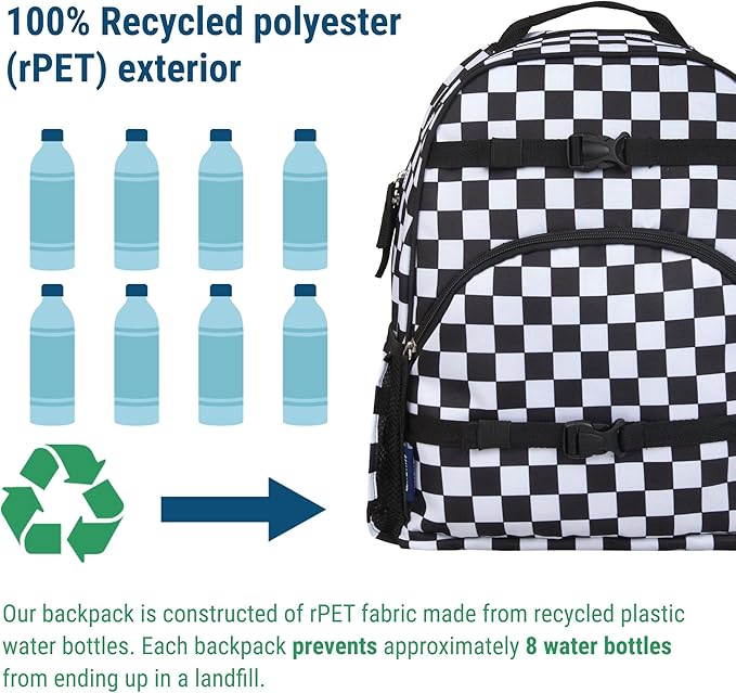 Wildkin ECO rPET 17-inch Large Backpack – Sustainable, Padded, Adjustable – Black and White Checkered