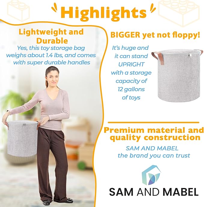 SAM AND MABEL XXL Toy Storage Organizer with Play Mat – 15" x 15" x 16" Storage Bin for Kids Playroom, Foldable Fabric Bag and Basket for Nursery (Gray)