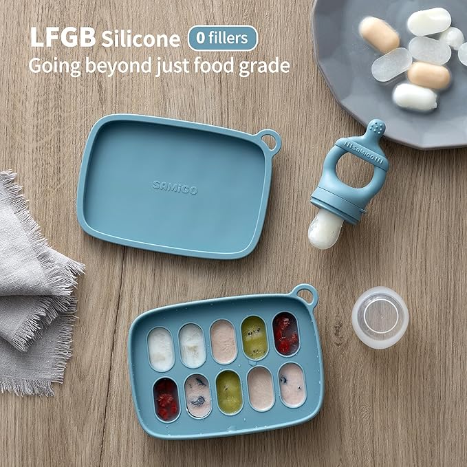 SAMiGO Baby Food Fruit Feeder and Breastmilk Popsicle Mold Set, Silicone Fruit Teether, Food Feeder Pacifier for Teething Relief, Freezer Tray, Baby Feeding Essentials, 4 Months+