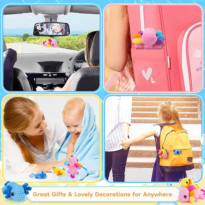 - đșăAll-In-One Crochet Starter KităAuspicious beginning Axolotl crochet kit for beginners comes with everything you need to create adorable crochet animal kit: 3 Axolotl pattern. 2 basic crochet manual, 6 different colored yarns, 1 needle, 4 eyes, 5 stitch markers, 2 crochet hook, 1 sessor, beginner's step by step video and stuffing. As packaging all the necessary tools together in giftbox. It's save much time and effort to search for each component individually.