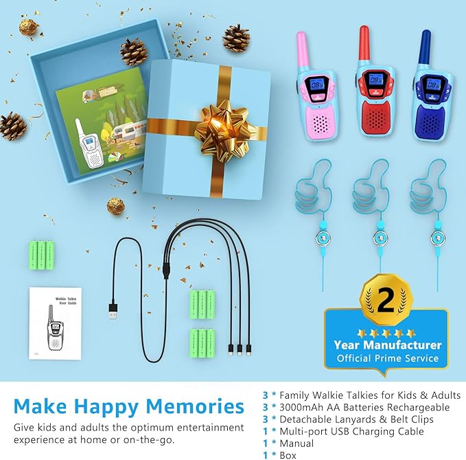- Included Components : 1 * Manual & 3 Year Manufacturer Service, 1 * Multi-port USB Charging Cable, 3 * 3000mAh AA Batteries Rechargeable, 3 * Detachable Lanyards & Belt Clips, 3 * Family Walkie Talkies for Kids & Adults 1 * Manual & 3 Year Manufacturer Service, 1 * Multi-port USB Charging Cable, 3 * 3000mAh AA Batteries Rechargeable, 3 * Detachable Lanyards & Belt Clips, 3 * Family Walkie Talkies for Kids & Adults