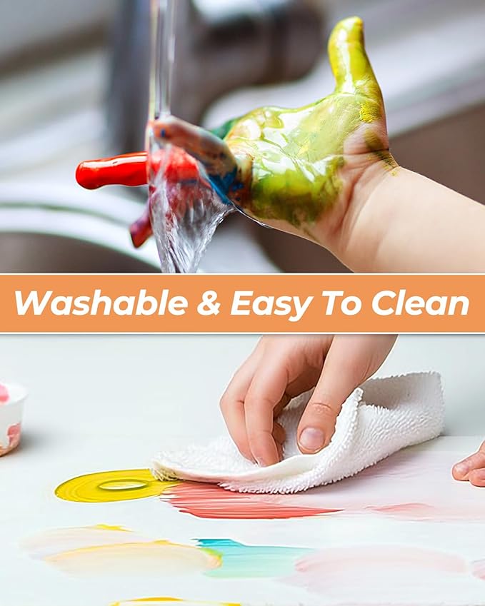 - Washable & Easy to Clean – These water-based paints rinse easily from hands, clothes, tables, and more with just soap and warm water—no scrubbing required. Paired with no-spill cups, they ensure quick, stress-free cleanup at home, school, or during art parties.
