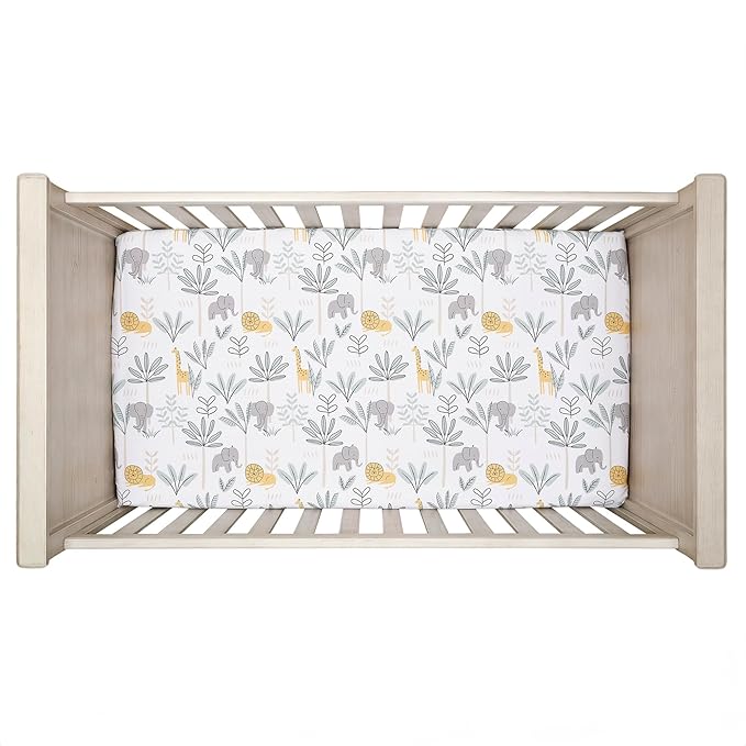 • Breathable 100% cotton fitted crib sheet with lions, giraffes, elephants and foliage