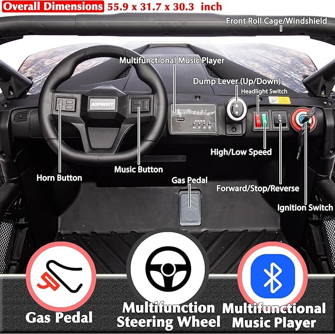- Kids’ UTV with 1.4 Cu.Ft Dump Bed: The dump bed of this kids’ UTV is electric, kids can lift and down the dump bed by operating the joystick and handle, and it comes with a plastic shovel, your little kids can enjoy a transport experience with this side-by-side UTV. And the multifunctional music panel provides built-in music and devices connection functions (AUX/USB interface and wireless connection), enhances entertainments of this kids' toy car.