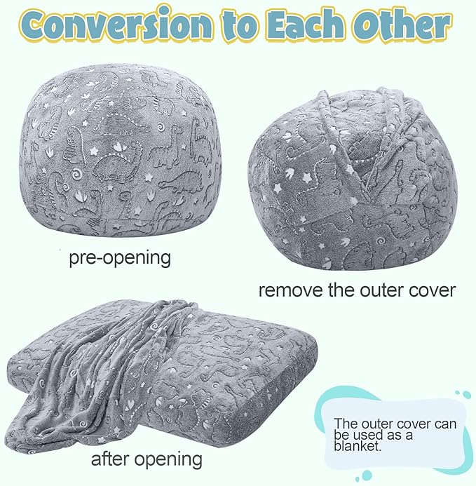 - Dinosaur Bean Bag Chair: This toddler bean bag chair with glowing unicorn pattern. Expose the fluffy bean bag chair to sunlight or light during the day, the small bean bag with a soft glow adds a touch of wonder to any kids' room at night