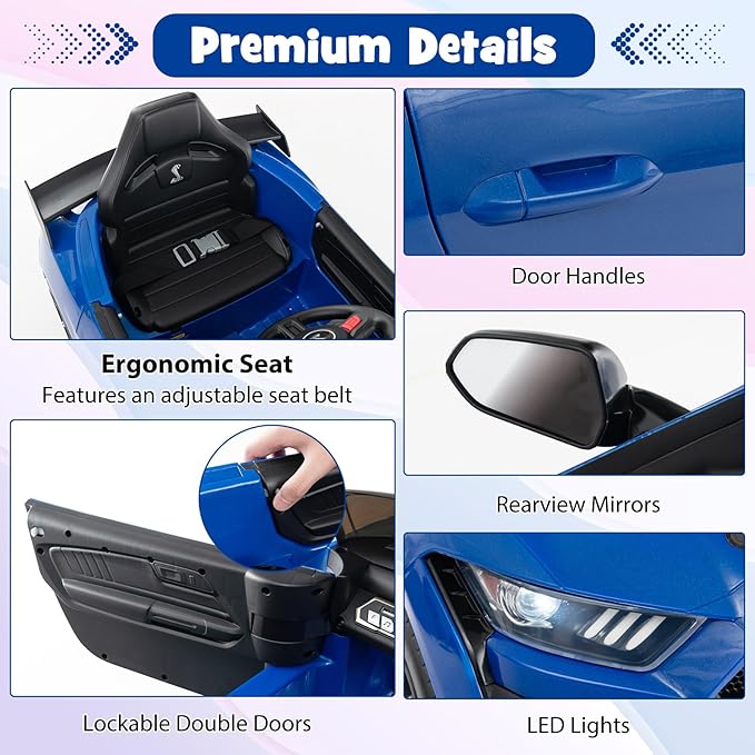 Costzon Ride on Car, 12V Licensed Ford Mustang Shelby GT500 Kids' Electric Vehicles w/Remote Control, USB Port, Radio, Music, Player, High Low Speed & Soft Start, Racing Kids Car for Toddler (Blue)