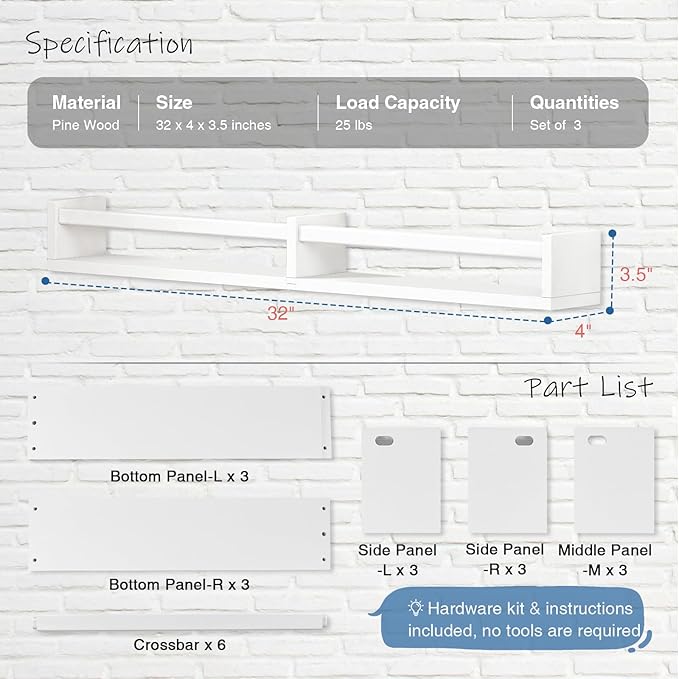 - [What you Get] 3 x 32 Inches Long Nursery Book Shelves (32"W x 4"D x 3.5"H"), 1 x Hanging Ruler for Drilling, 1 x Mini Level, All Necessory Screws and Anchors, 1 x Instruction Manual.