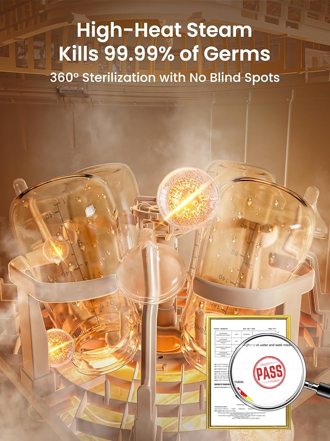 - 𝐄𝐟𝐟𝐢𝐜𝐢𝐞𝐧𝐭 𝐒𝐭𝐞𝐫𝐢𝐥𝐢𝐳𝐚𝐭𝐢𝐨𝐧 𝐚𝐧𝐝 𝐃𝐫𝐲𝐢𝐧𝐠: The 212°F high-temperature steam kills 99.99% of germs effectively, the subsequent hot air drying ensures bottles are spotless and ready for immediate use. This baby bottle sterilizer and dryer provides a hygienic environment for your baby.