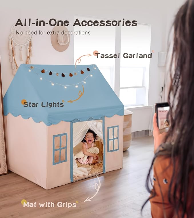 Play Tent with Mat, Star Light Large Kids Playhouse with Windows Easy to Wash, Indoor and Outdoor Play Tents for Kids, Little Dove Toys for Girls, Boys, 47x40x52 (Blue Playhouse, Large Size)