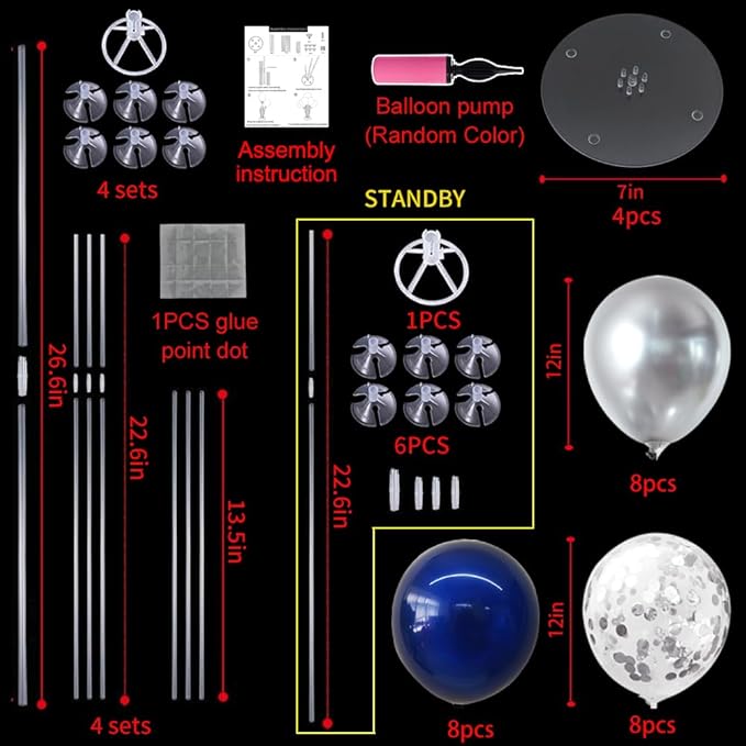 - Package Includes: The balloon stand kit includes 4 reusable balloon centerpiece table decorations and 12 inch 32 pcs Latex Balloons (8 silver balloons,8 grey balloons,8 dark blue balloons,8 silver confetti balloons),glue point dots,balloon pump,balloon clips,and tie tool.You don’t need to waste money to buy balloons
