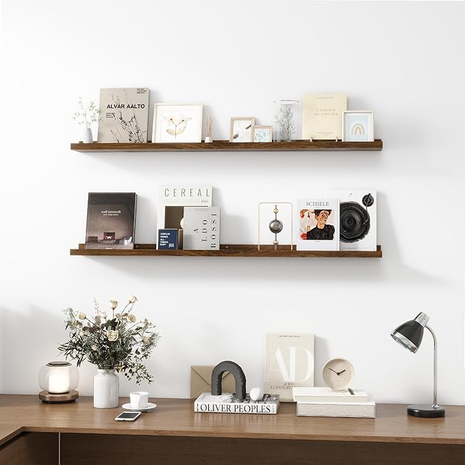 Picture Ledge Shelf, Wood Long Floating Shelves for Wall, Set of 2, 48 inch Picture Ledge Shelves, Photo Ledge Nursery Book Shelves Wall Mounted for Living Room Kids' Room Bedroom, Color Walnut