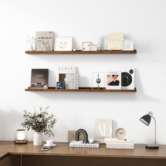 Picture Ledge Shelf, Wood Long Floating Shelves for Wall, Set of 2, 48 inch Picture Ledge Shelves, Photo Ledge Nursery Book Shelves Wall Mounted for Living Room Kids' Room Bedroom, Color Brown