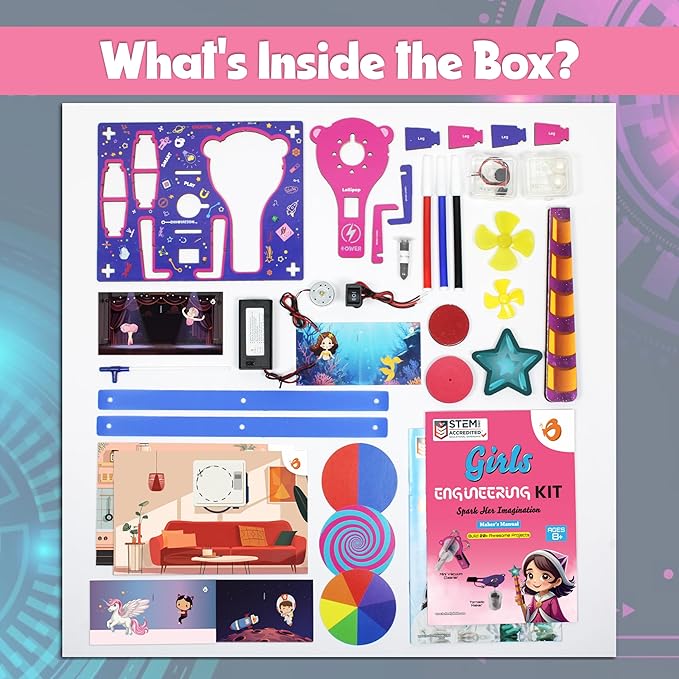 - ⭐ [DIY Engineering Science Kit for Girls Age 8-12]: This STEM DIY kit includes 50 pieces of circuit that can be transformed into numerous exciting prototypes. Build a Vacuum Cleaner toy, Spin Art machine, Magic Wand, Tornado mixer, hovercraft, static mixer, crazy bug, animation illusion, Earth model, 2D-3D shapes, centrifuge mania, color mixer, motorboat, Draw Robot and more!
